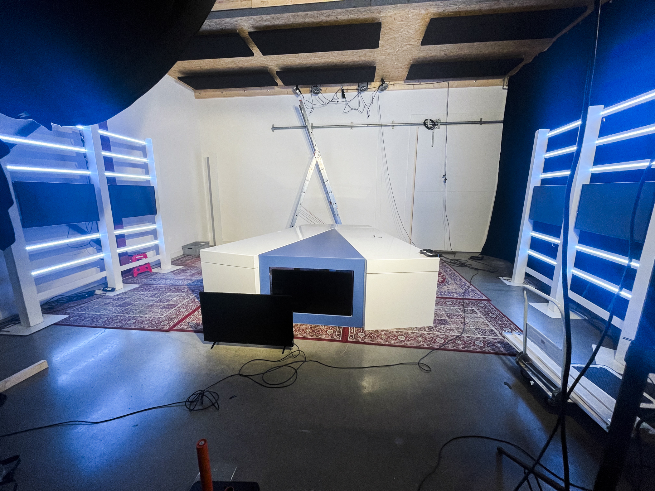 Op zoek naar een livestream studio? Zoek niet verder! We hebben onze studio standaard ingericht als livestream studio inclusief talkshowtafel en decorwand. Compleet klaar met belichting en camera's. Onze studio is verder multi-inzetbaar, uitermate geschikt als fotostudio, voor opnames van podcasts of voor workshops.