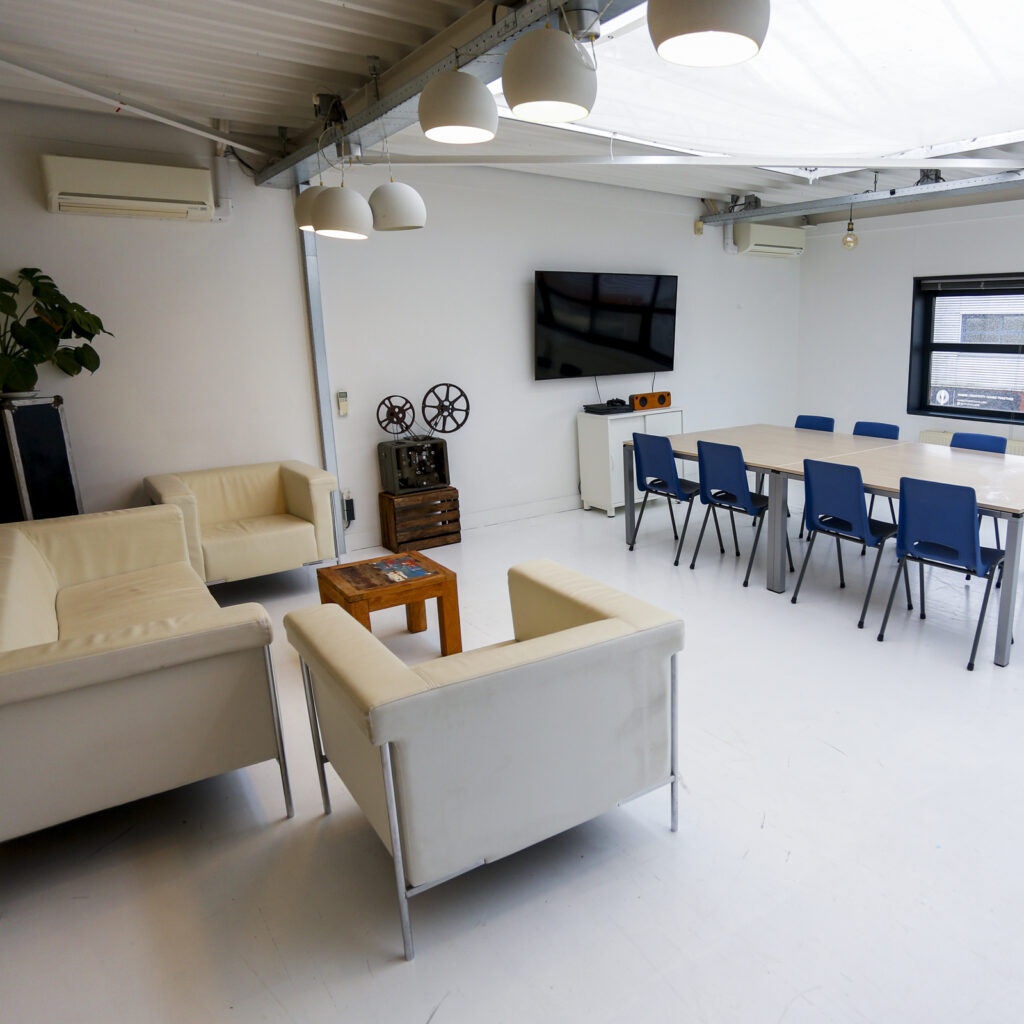 Op de eerste verdieping hebben we een ‘chille’ vergaderruimte die erg geschikt is als green room, productieruimte of workshop ruimte. Deze ruimte is standaard inbegrepen bij de huur van de studio. Hier is ook een volwaardige keuken inclusief gevulde koelkast aanwezig.